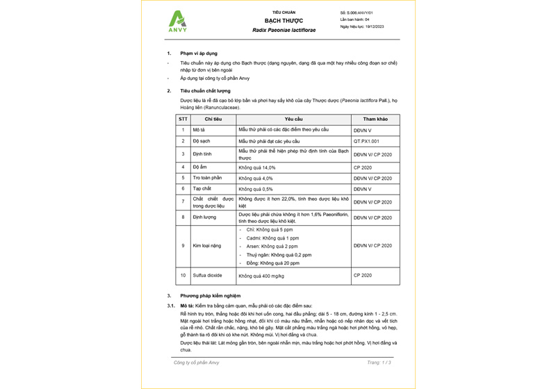 | Bạch thược (Paeoniflorin ≥ 0,3%) |